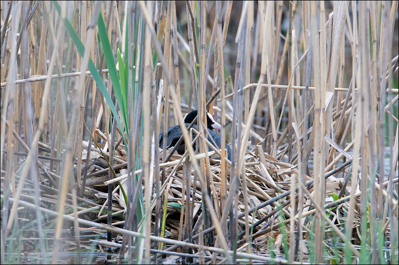 08-05-07. Inte lätt att upptäcka ligger sothönan och ruvar i vassen.
