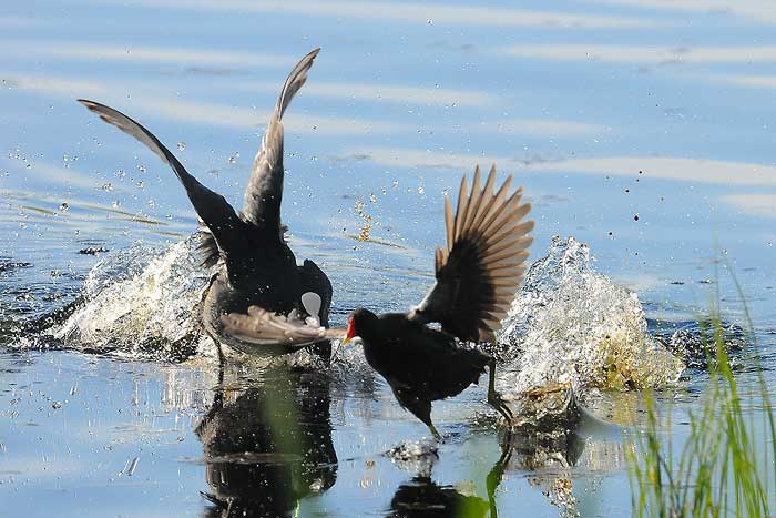 Vi fortsätter att spana på rörhönorna. Det gör också de aggressiva sothönorna som gärna jagar bort sin släktingar när de kommer för nära.