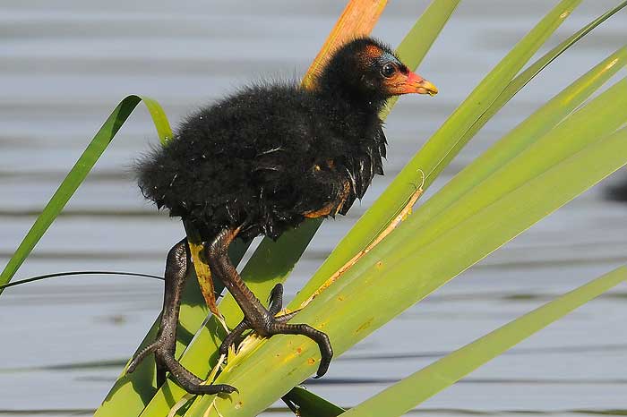 Här har en rörhöneunge klättrat upp ur vattnet, antagligen för att visa hur otroligt stora fötter den har.