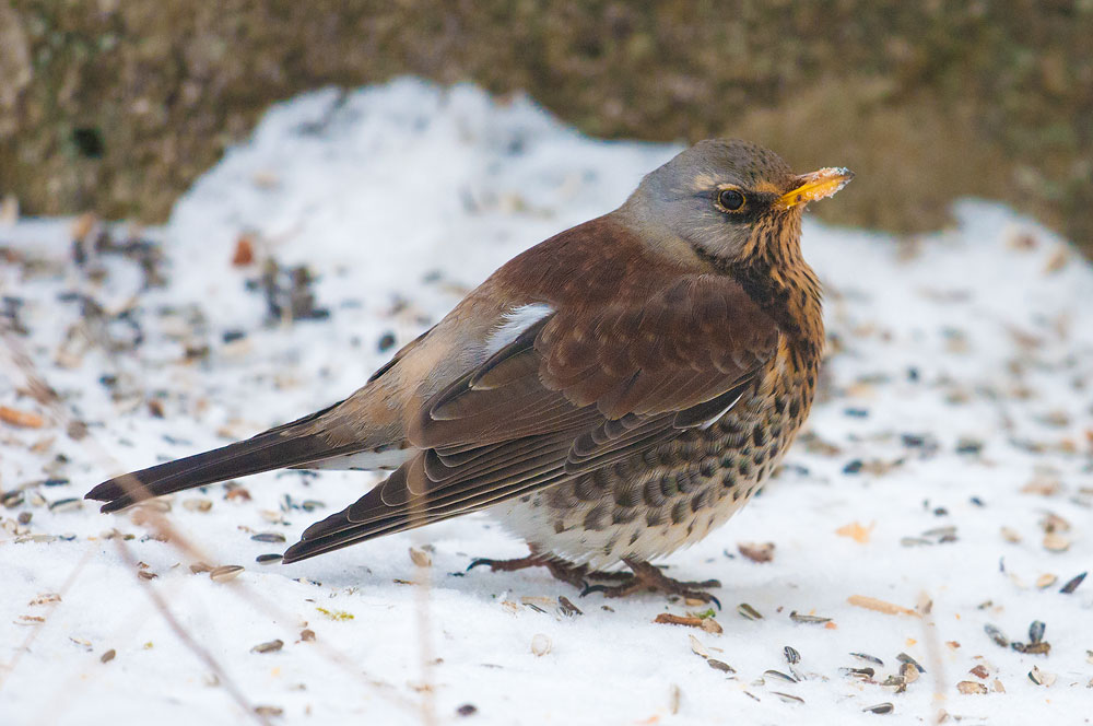 Någon vänlig själ har lagt ut äpplen vid matningen och det har lockat många trastar.